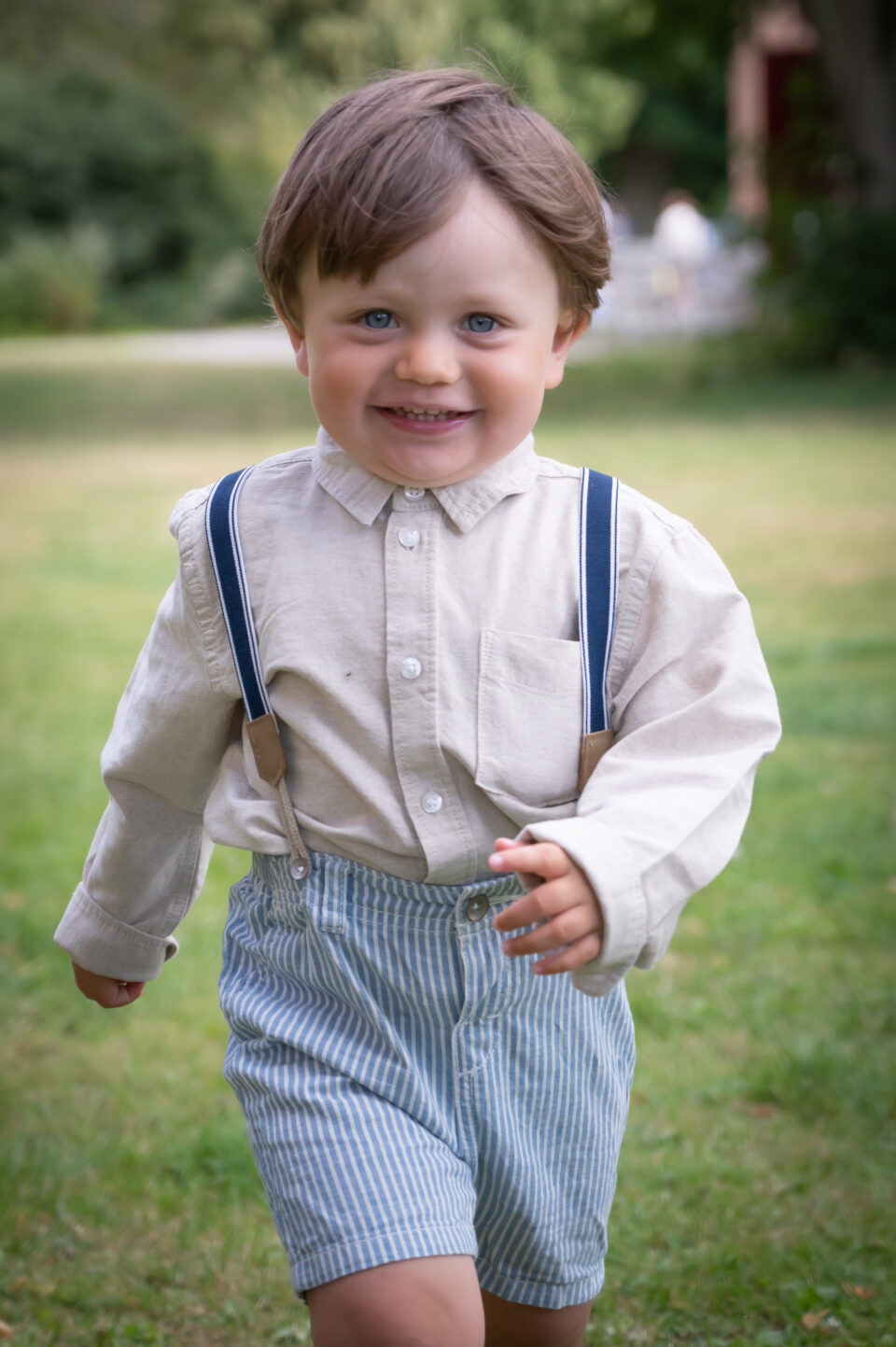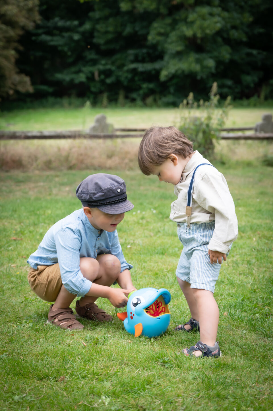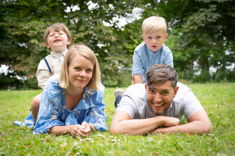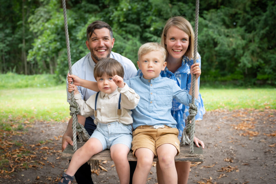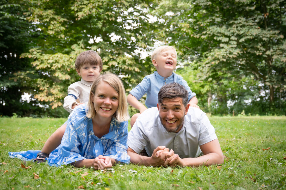En fartfylld familjefotografering med springtävling och såpbubblor.