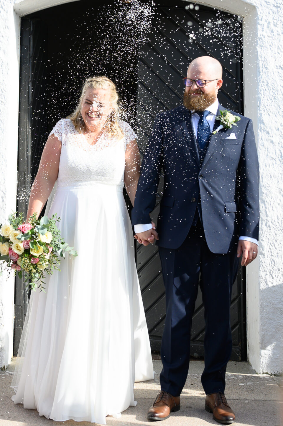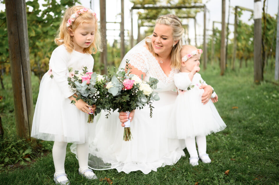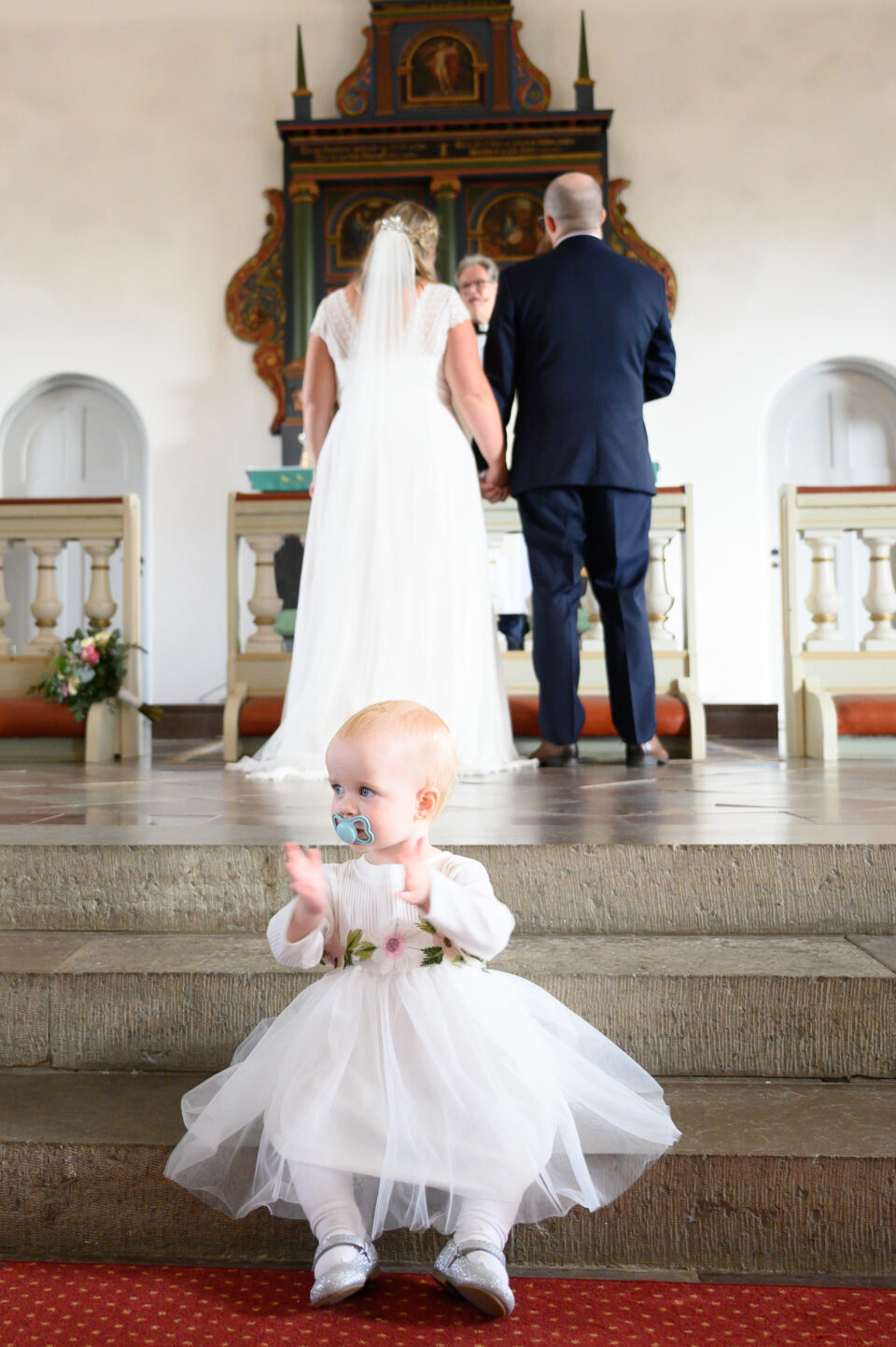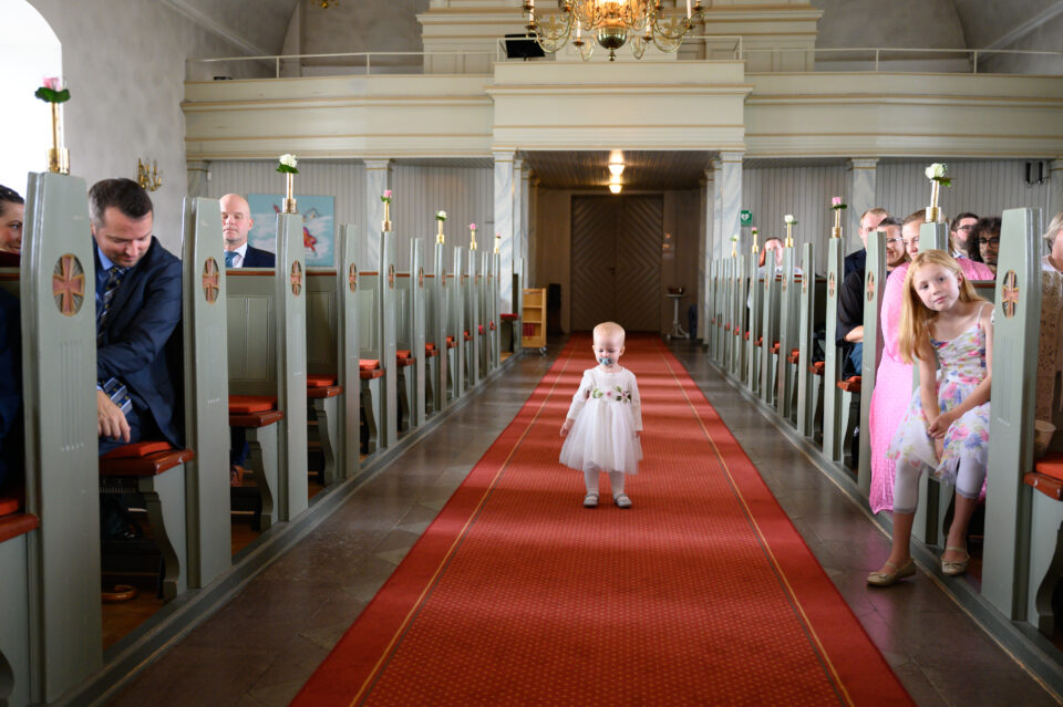 Vigsel med tre barn är ett härligt äventyr och massor av roliga fototillfällen! Givetvis med brudparet i fokus, men den minsta lilla stjärnan Ella hade sin egen agenda och lockade tillsammans med storasyster Saga fram många skratt när dom lekte på trappan i kyrkan. Noga övervakade av mormor och fotografen som med stor ära var behjälplig när det skulle klättras upp och ner för de stora trappstegen. Vem kan motstå två små armar som sträcker sig mot en för hjälp? Inte jag i varje fall!