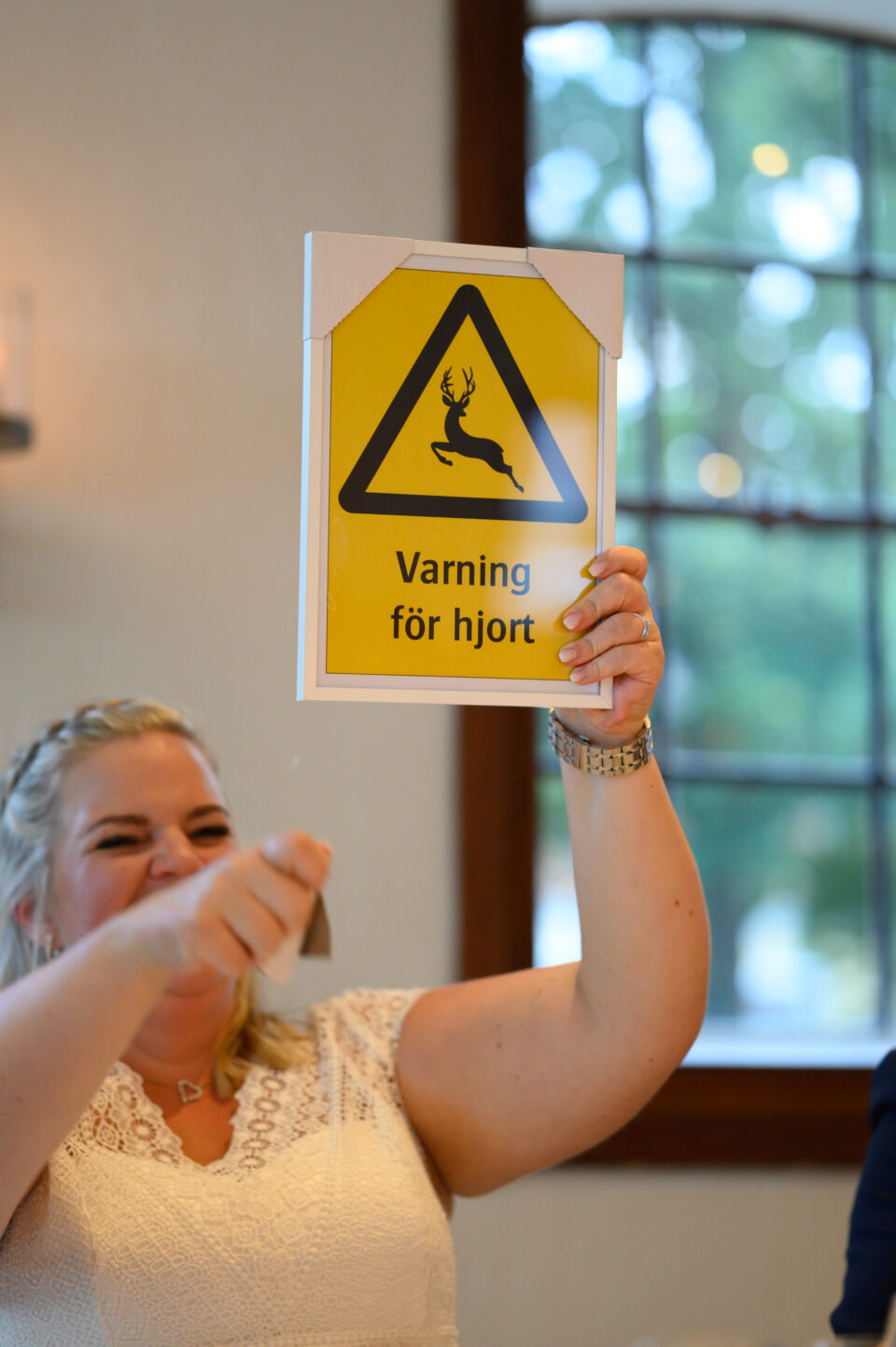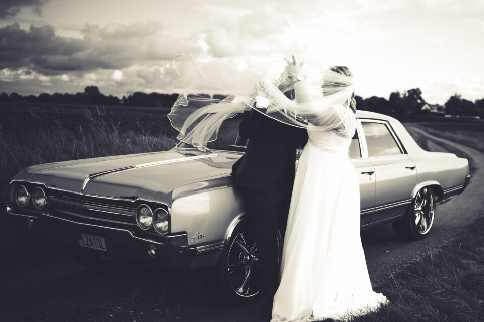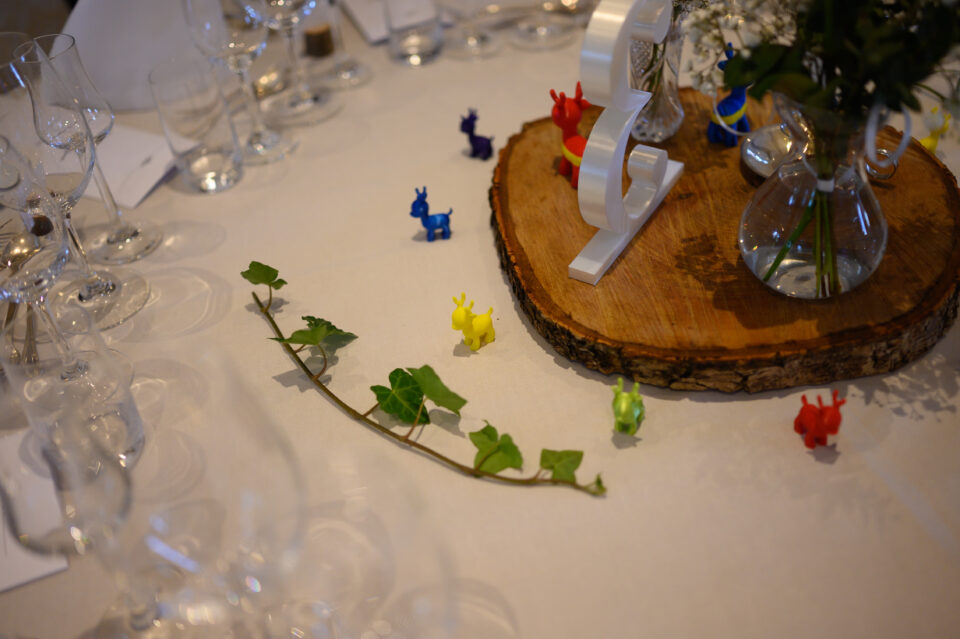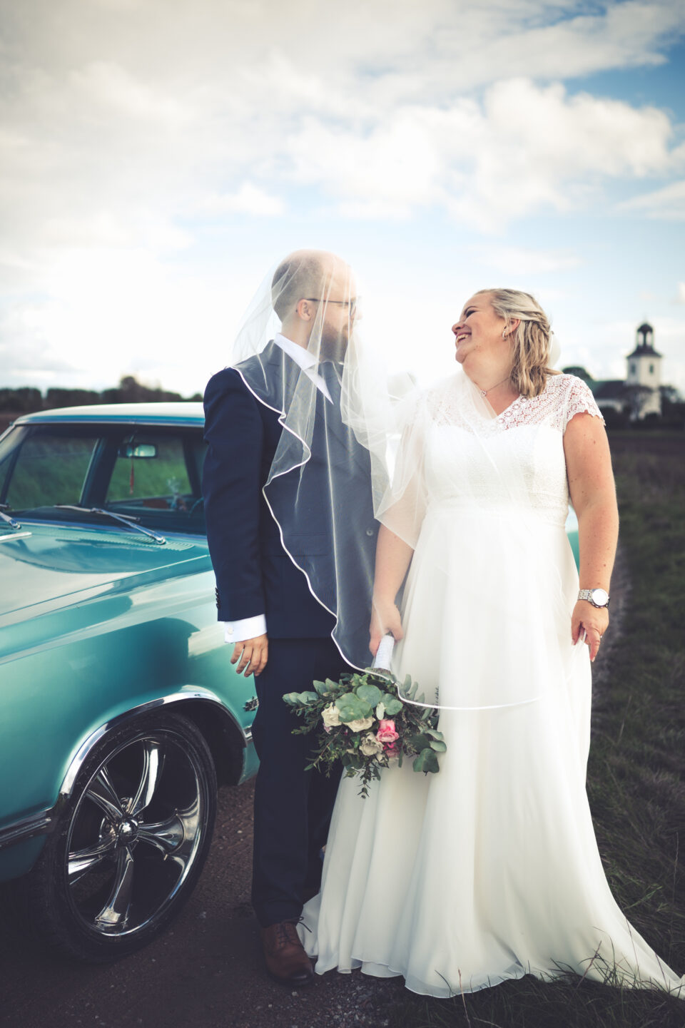 Ett blåsigt Karaby Backar med dramatiska moln gjorde fotograferingen till ett äventyr, slöjan levde sitt eget liv och den häftiga gamla bilen med sin turkosa färg gjorde kontrasterna klockrena. Tillbaka till Flädie Mat & Vingård där brudskål och mingel hölls efter brudparets storstilade entré, lite kyligt men molnen hade skingrat sig och solens strålar kom fram. Under middagen hade jag span på kvällssolen och jovisst, med tillåtelse från Toastparet kunde jag ta ut brudparet för solnedgångsfotografering. Middagen bjöd på skratt, tårar, sång, tal och roliga upptåg. Familjen som nu heter Hjort i efternamn hade gått all-in på temat och varje bord hade små 3-d printade Hjortar som dekoration. Nu är det Hjort! Dessutom firades Ola som i dagarna skulle fylla 40.