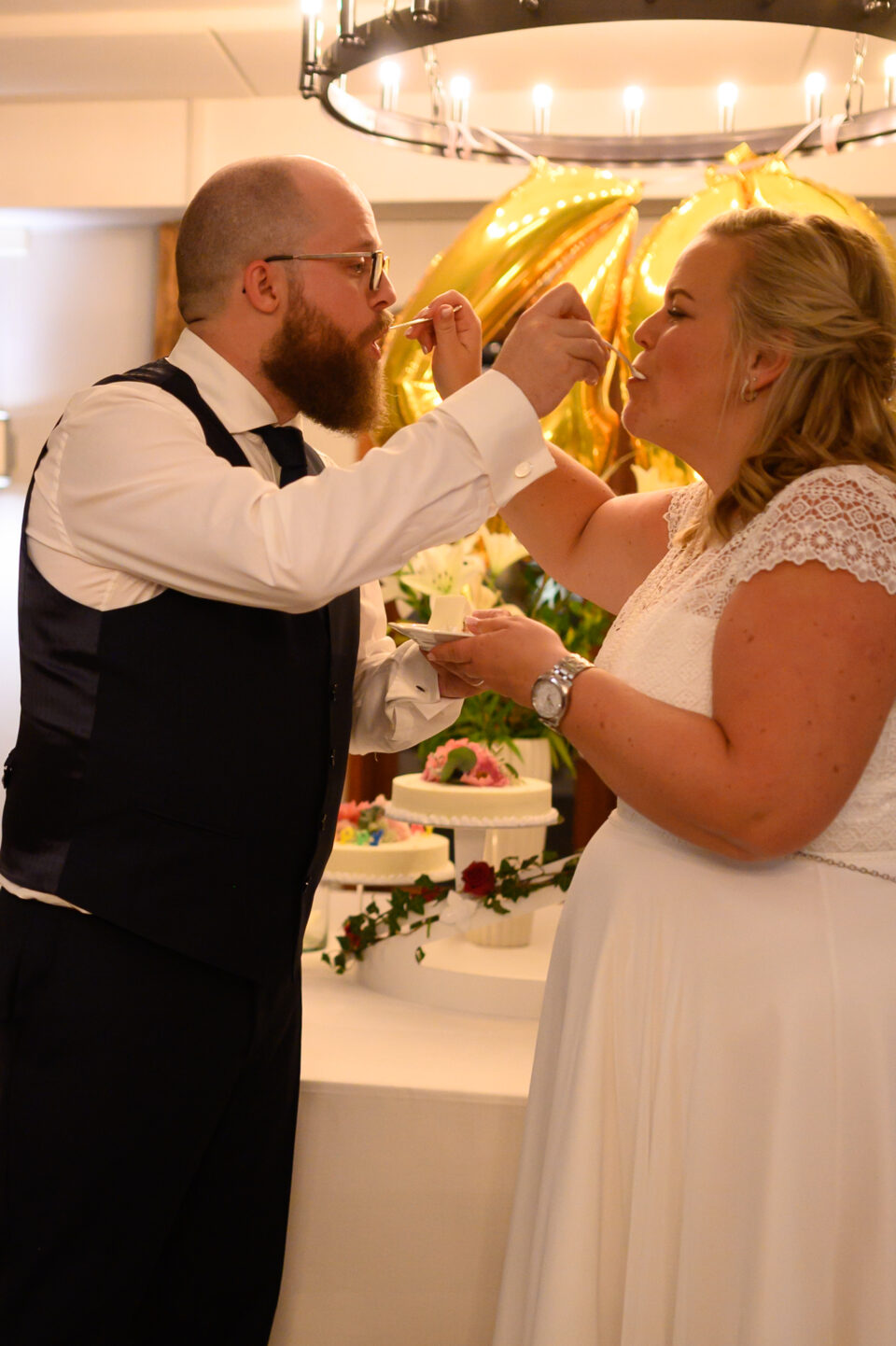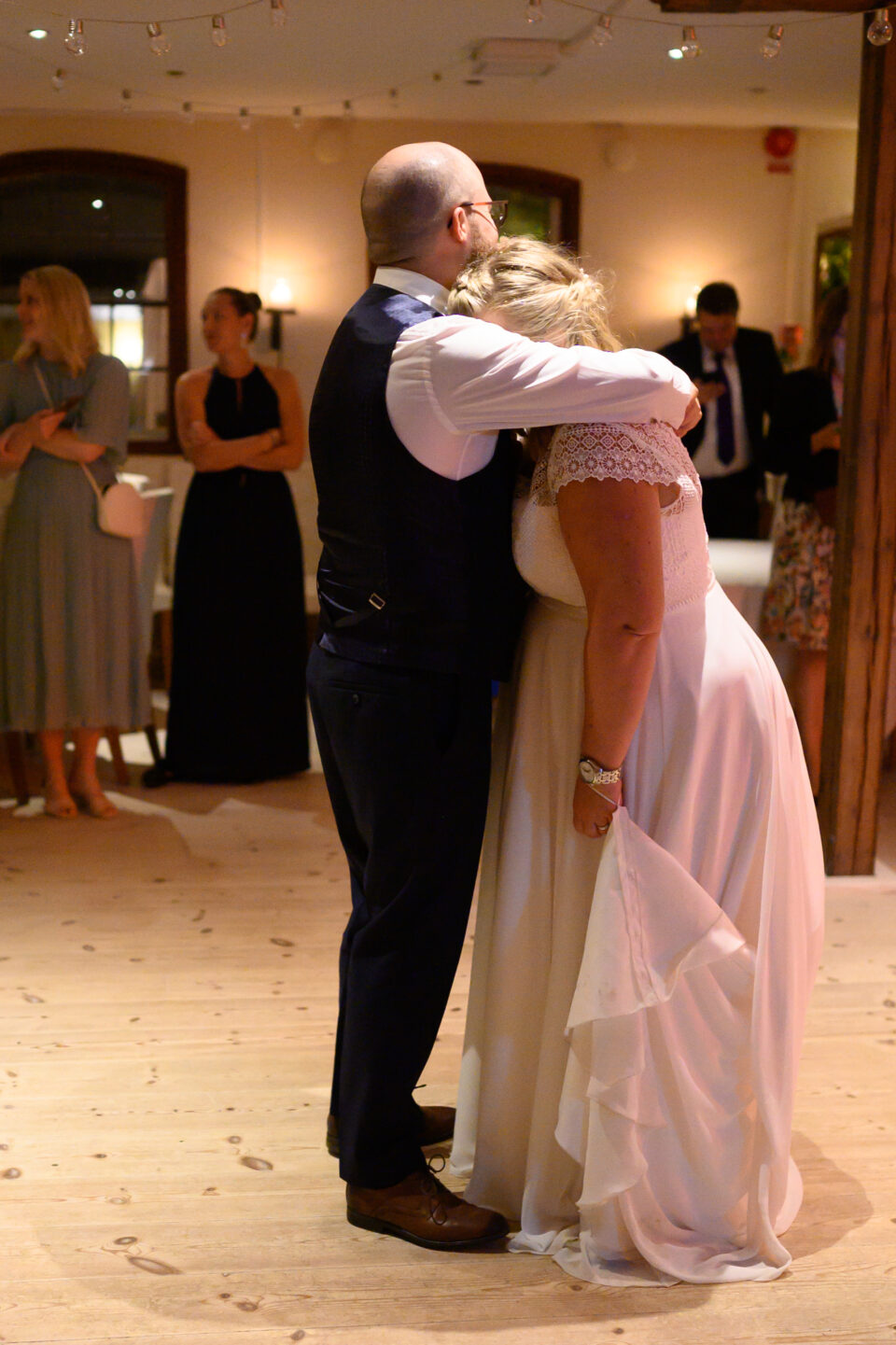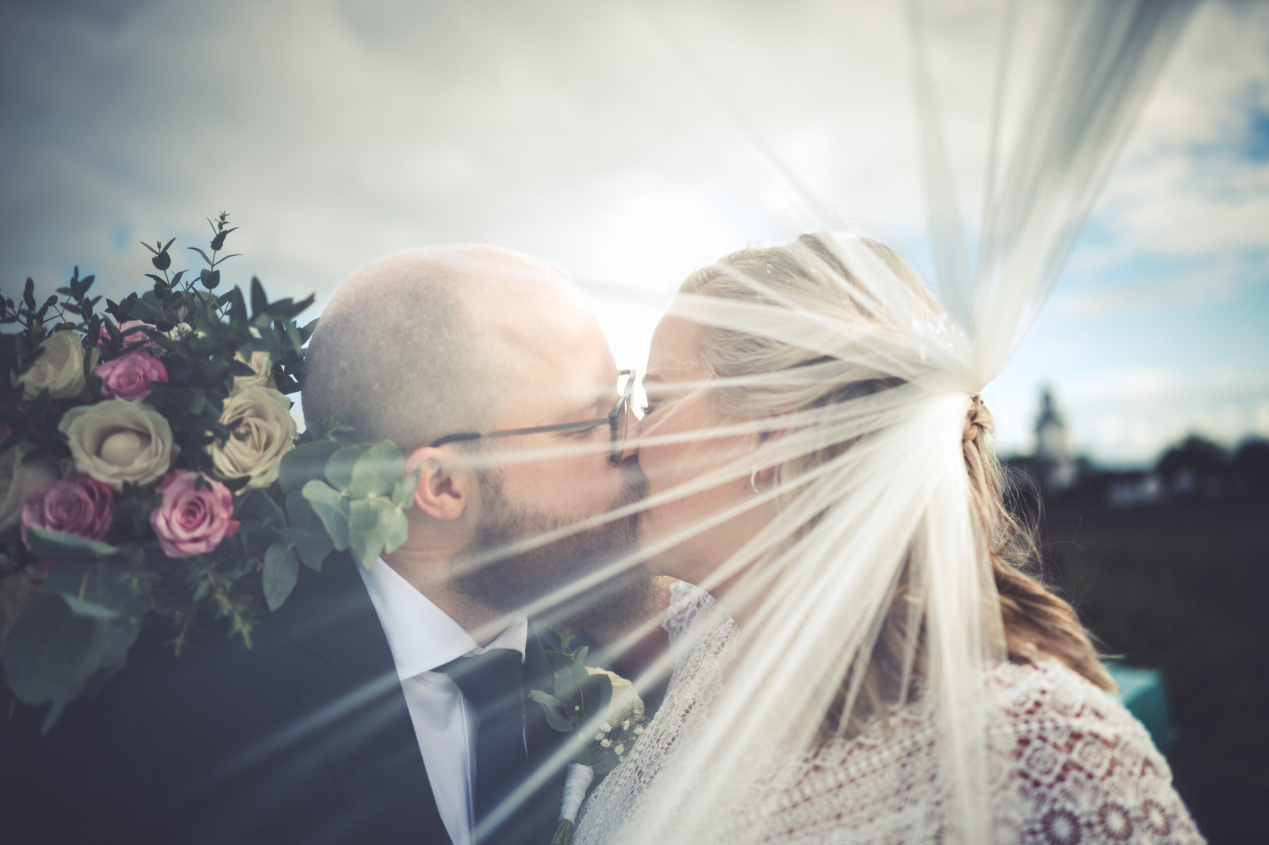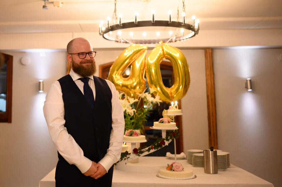 Ett blåsigt Karaby Backar med dramatiska moln gjorde fotograferingen till ett äventyr, slöjan levde sitt eget liv och den häftiga gamla bilen med sin turkosa färg gjorde kontrasterna klockrena. Tillbaka till Flädie Mat & Vingård där brudskål och mingel hölls efter brudparets storstilade entré, lite kyligt men molnen hade skingrat sig och solens strålar kom fram. Under middagen hade jag span på kvällssolen och jovisst, med tillåtelse från Toastparet kunde jag ta ut brudparet för solnedgångsfotografering. Middagen bjöd på skratt, tårar, sång, tal och roliga upptåg. Familjen som nu heter Hjort i efternamn hade gått all-in på temat och varje bord hade små 3-d printade Hjortar som dekoration. Nu är det Hjort! Dessutom firades Ola som i dagarna skulle fylla 40.