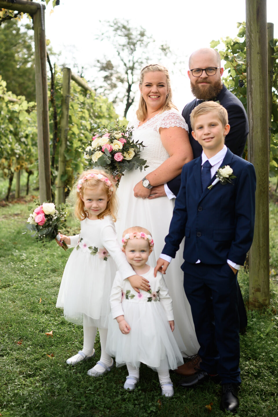 Det sprack upp och vi gick ut i vingården där vi fortsatte fotograferingen, men det var inte speciellt lång stund vi hann vara där förrän det började regna omåttligt igen. Alla glada trots regn, alltså – jag måste säga, denna familjen har en sån positiv syn till allt och det smittar av sig.