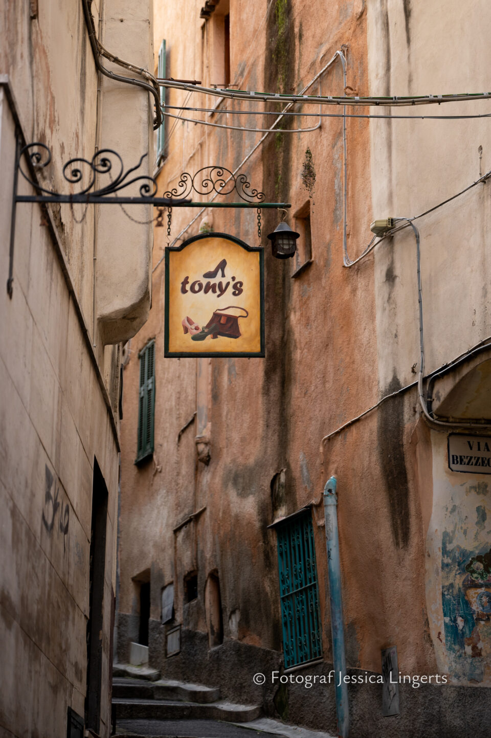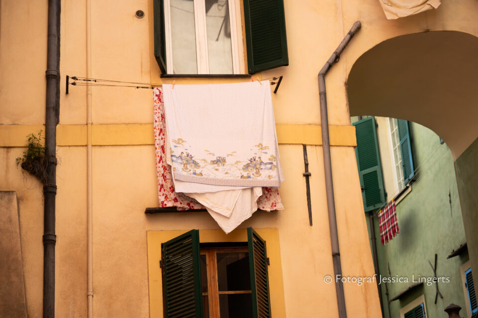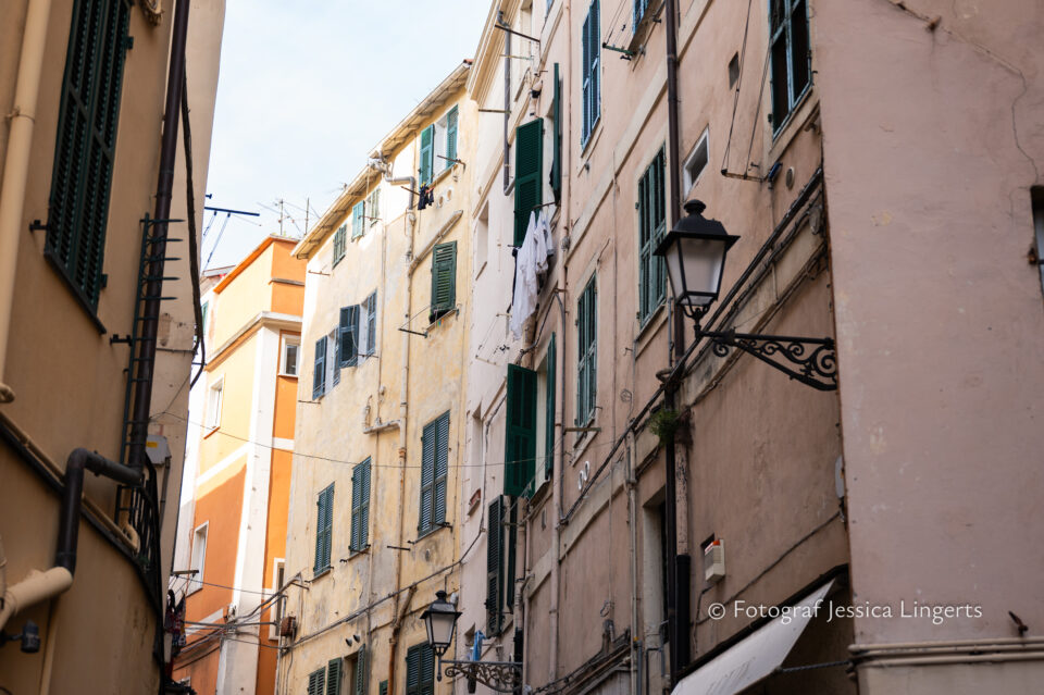 Buongiorno Sanremo! Frukosttokiga som vi båda är intog vi frukostbordet med storm. Prosciutto, salami, ostar, croissanter, kaffe (som smakade tvi vale de första två försöken), fruktsallad, nötter, ägg, juice och en massa andra gottigheter. Vi åt och njöt av lugnet och utsikten över havet och palmerna, att “matsalen” dessutom hade William Morris-tapeter på väggarna var ju en extra wow-faktor. Mätta och belåtna tog vi oss an Sanremos vackra gränder, tisdag och marknad stod på schemat. La Pigna, det gamla stadsdelen bjöd på häpnadsväckande byggnader och roliga detaljer i de små gränderna. Shopping blev det såklart och sedan vätskepaus med lite chark och ostar som lunch. Kaffe och glass och strosande tills det blev dags för middag. En restaurang vid namn Flipper fick vår uppmärksamhet, kanske var det deras stora värmare som lockade oss. Detta var den absolut bästa måltiden för oss båda under vår resa. Tina som beställde musslor fick en söt liten hakklapp knuten runt halsen av servitören, vi brast självklart ut i skratt. Jag fick ingen, det hörde tydligen inte till när man ska äta ravioli…. Men, innan huvudrätten kom in så serverades det prosecco och underbart goda små snittar eller vad man ska kalla det för. Det är ju en otroligt trevlig idé, att baka in lite extra trevligheter i priset. Mycket bra och mycket trevligt! Tina hummade mest och slurpade i sig sina musslor, mina ravioli tog inte hälften så lång tid att få i sig. Men, om sanningen ska fram så var jag lite avis på hennes stora och av hennes hummande att bedöma – alldeles ljuvliga musslor. Jag passade på att dricka en espresso innan vi lämnade restaurangen, mycket nöjda och mätta.