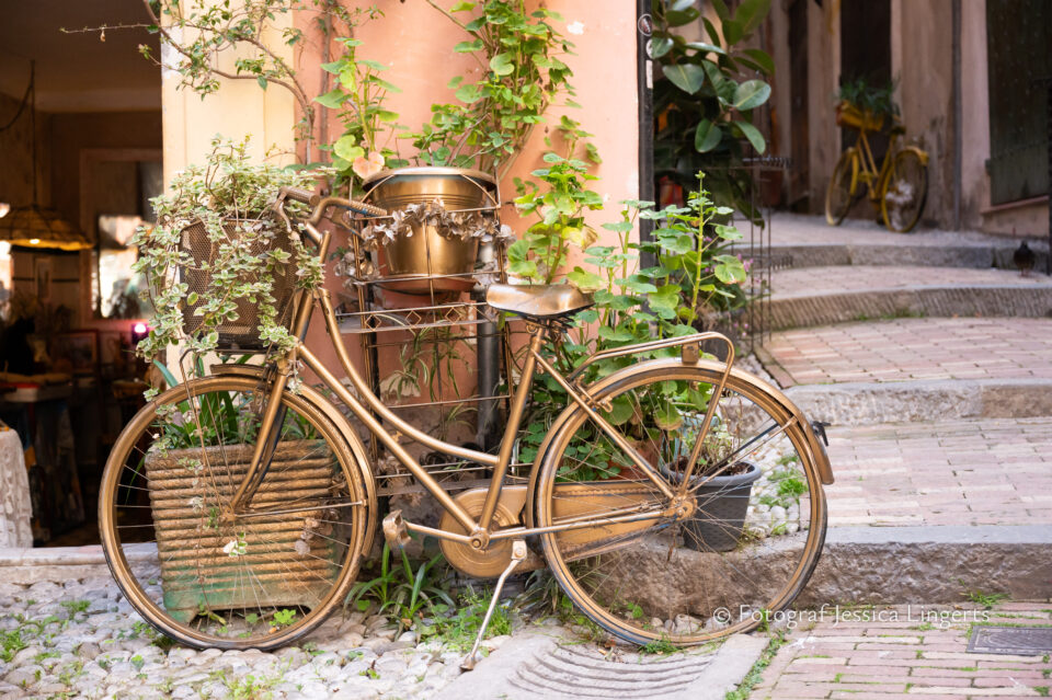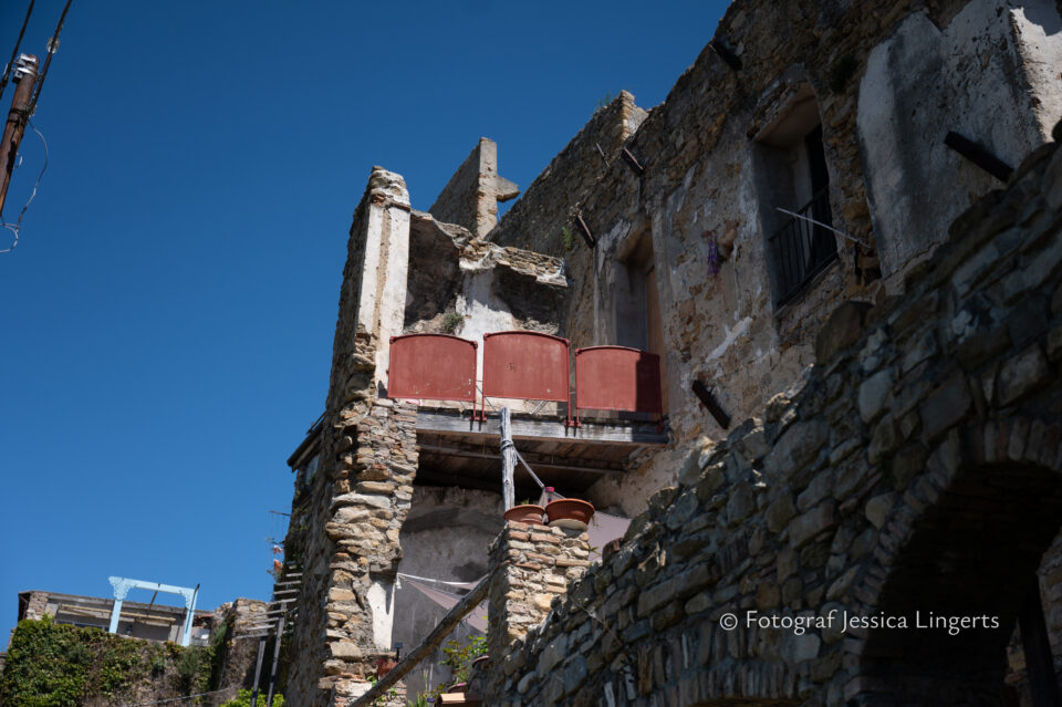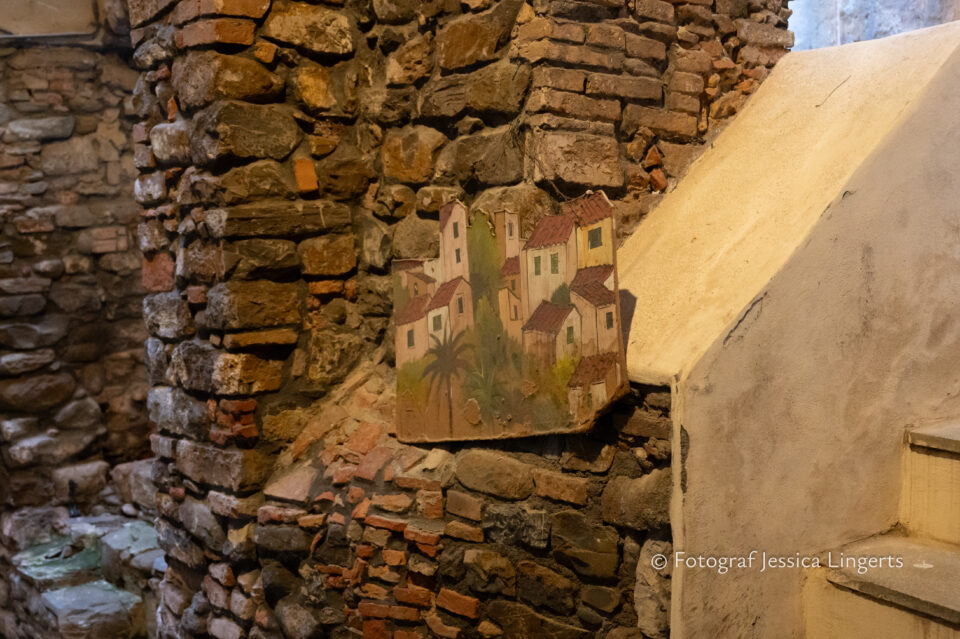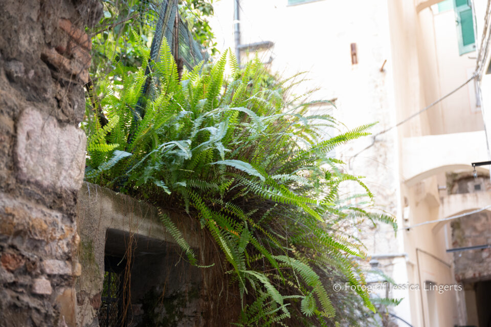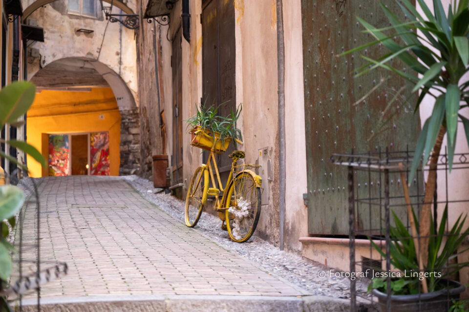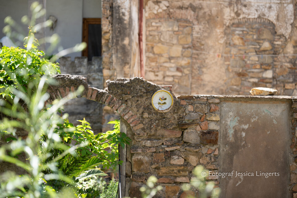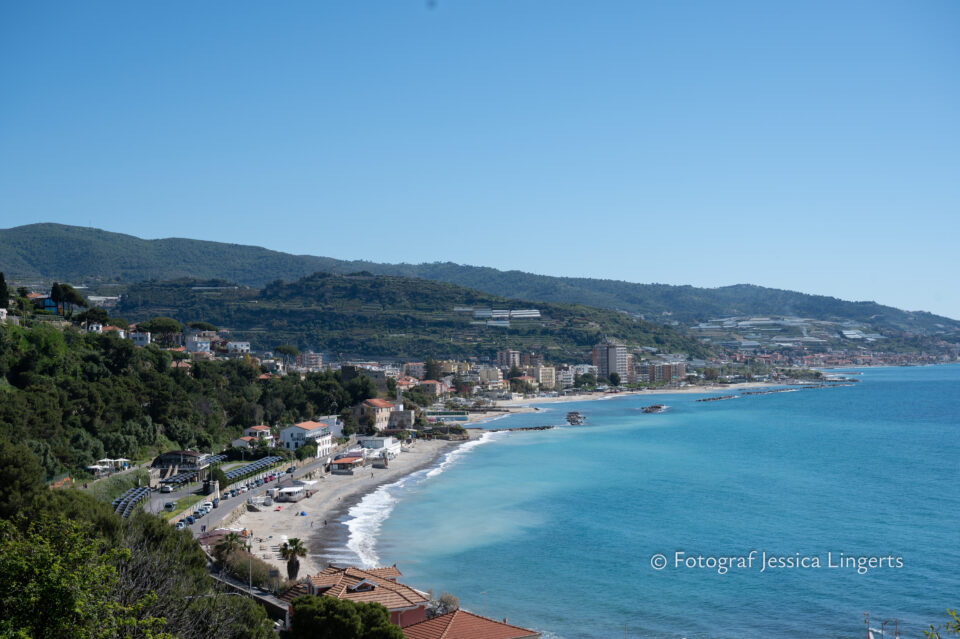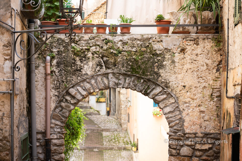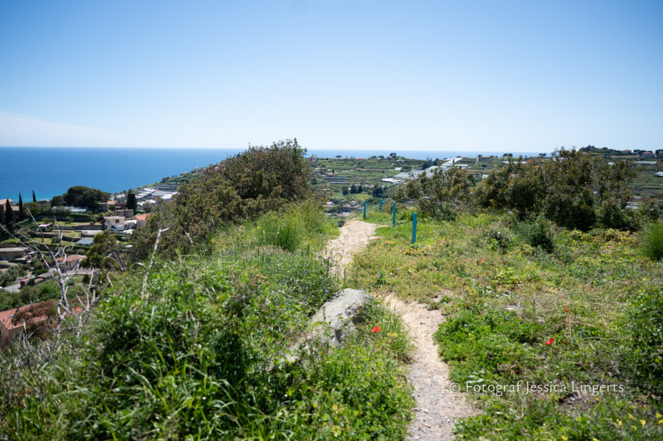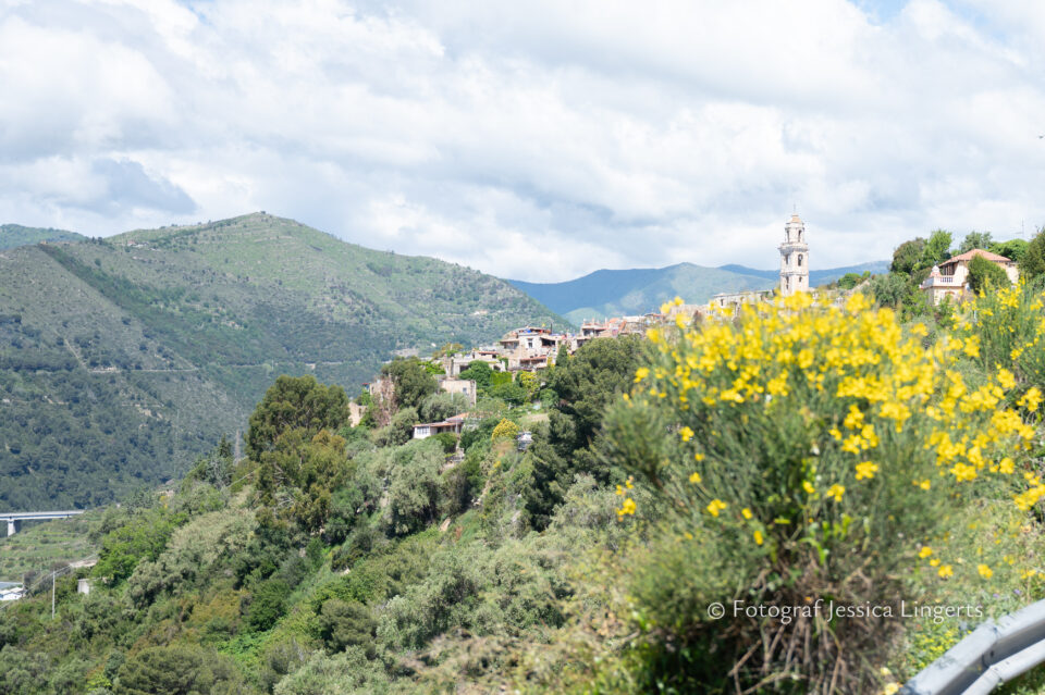 Frukostfrossa igen! Men, nu hade vi lärt oss vilken sorts kaffe vi skulle trycka i maskinen. Det var vi två och några få gäster till i matsalen så det blev ännu en lugn och skön frukost. Målet för dagen var Bussana Vecchia, “spökbyn” eller “konstnärsbyn” som den också kallas. 66 personer är bosatta i byn och det tog en 20 min bussfärd, promenad i en gullig by (viss del av promenaden hade kunnat undvikas om vi startat google maps) och en otroligt lång snirklig stig för att komma dit. Man kunde tydligen köra bil nästan hela vägen upp, men då hade vi inte sett allt det vi fick se. Enligt min app så gick vi 24 våningar uppåt, det var långt och det var varmt men vilken upplevelse! På den slingrande uppåtgående stigen fick vi se eucalyptusodlingar, citronträd, apelsinträd, en ödla, kaktusar, passionsblommor och till min stora förtjusning några Macaonifjärilar. När vi kom upp för kröken så kunde vi se växthusen ovanifrån, de som vi tidigare sagt “kolla på växthusen långt däruppe”. På första parkett efter kröken låg världens mysiga lilla restaurang, vi var ju såklart törstiga och lite småhungriga (vi hade ju faktiskt gått jättelångt) så prosecco, aperol spritz och bruscetta med tomater satt som en smäck. 200 meter upp fanns sedan målet för dagen Bussana Vecchia. 1887 drabbades staden av en jordbävning. Staden förstördes, och myndigheterna beslutade att uppföra en ny stad i närheten, det nya Bussana “Bussana Nuova”. På 1960-talet kom det konstnärer och hippies dit och de byggde upp staden igen. Spännande va? Här kan man läsa mer: