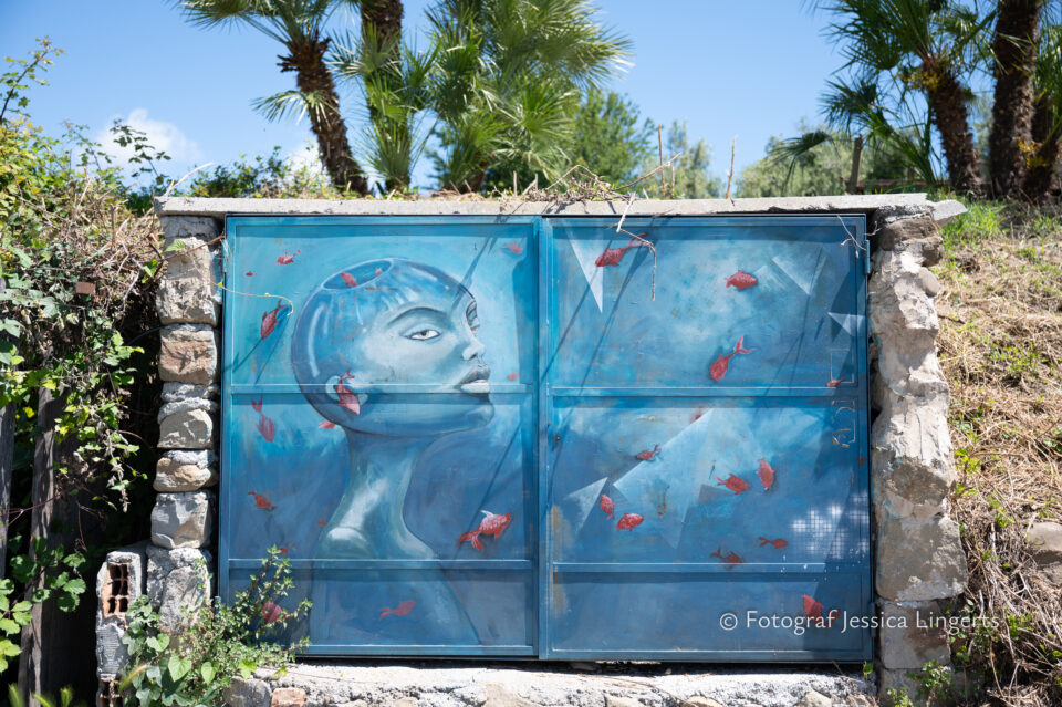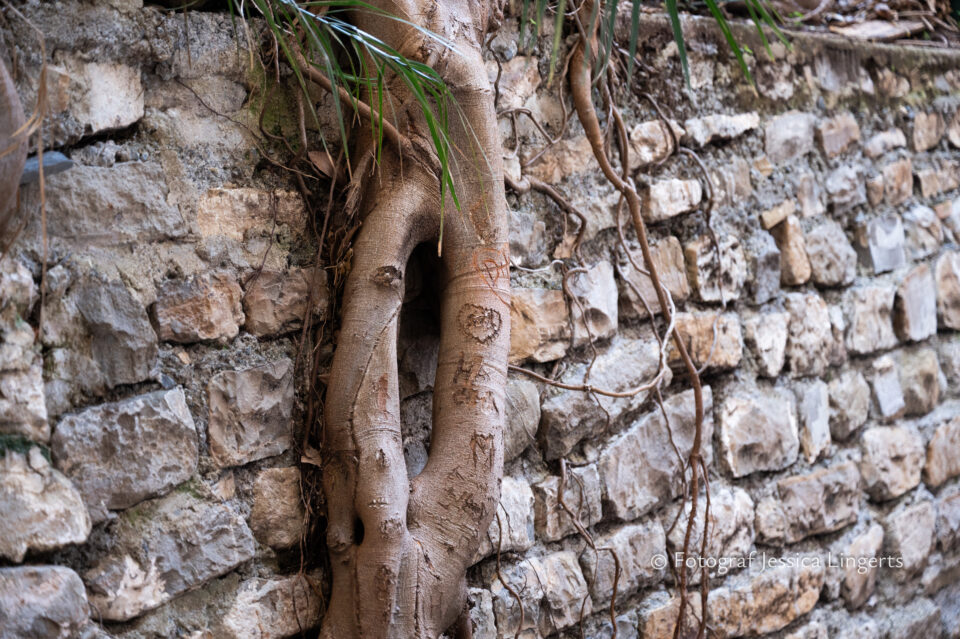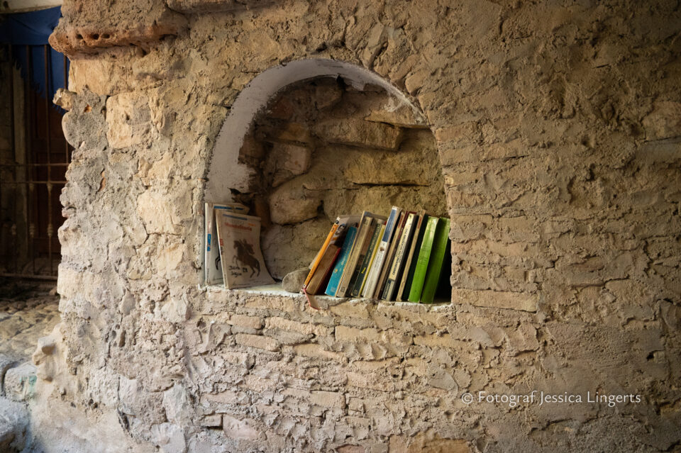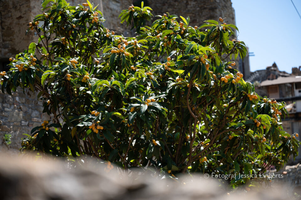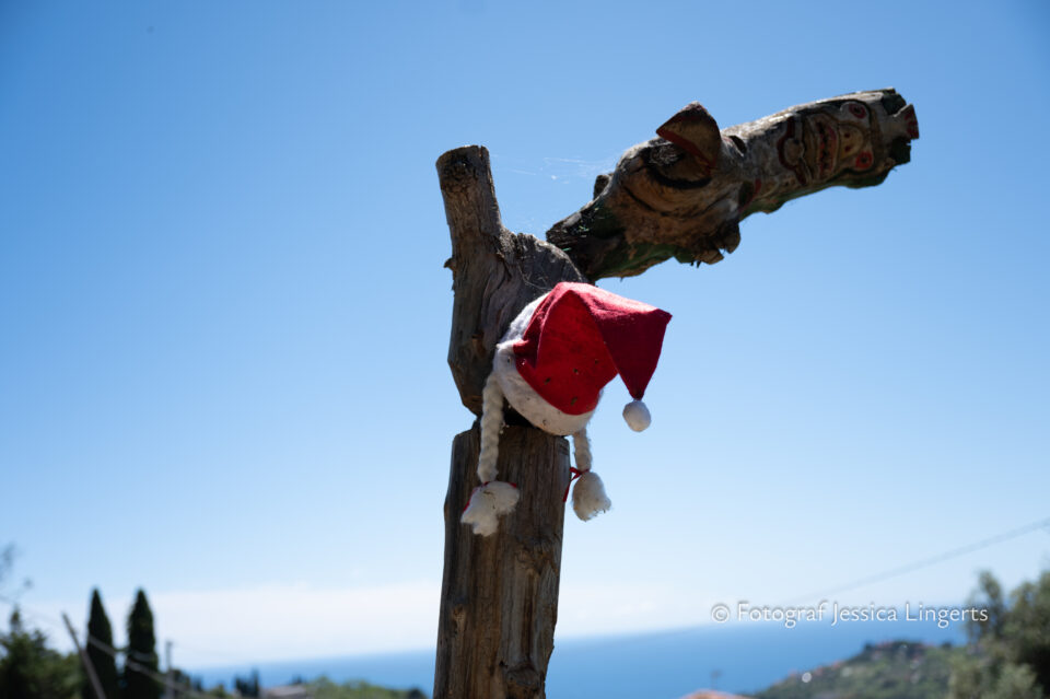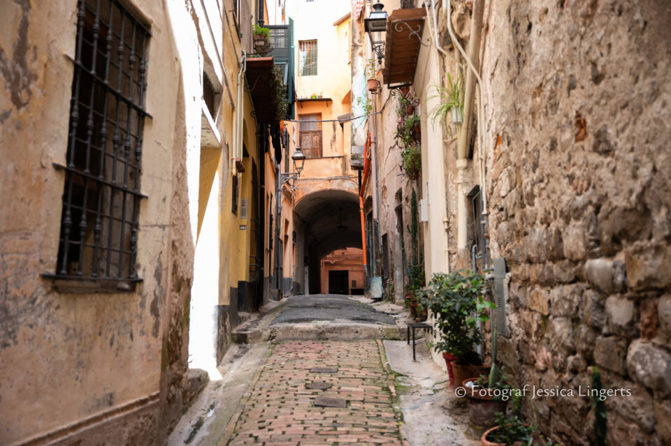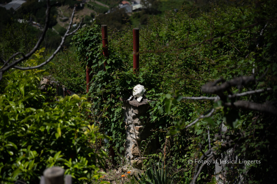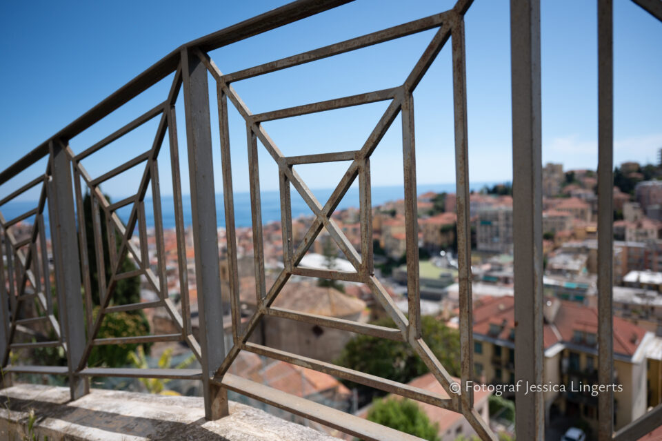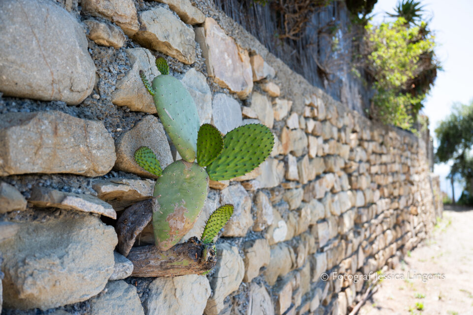 Frukostfrossa igen! Men, nu hade vi lärt oss vilken sorts kaffe vi skulle trycka i maskinen. Det var vi två och några få gäster till i matsalen så det blev ännu en lugn och skön frukost. Målet för dagen var Bussana Vecchia, “spökbyn” eller “konstnärsbyn” som den också kallas. 66 personer är bosatta i byn och det tog en 20 min bussfärd, promenad i en gullig by (viss del av promenaden hade kunnat undvikas om vi startat google maps) och en otroligt lång snirklig stig för att komma dit. Man kunde tydligen köra bil nästan hela vägen upp, men då hade vi inte sett allt det vi fick se. Enligt min app så gick vi 24 våningar uppåt, det var långt och det var varmt men vilken upplevelse! På den slingrande uppåtgående stigen fick vi se eucalyptusodlingar, citronträd, apelsinträd, en ödla, kaktusar, passionsblommor och till min stora förtjusning några Macaonifjärilar. När vi kom upp för kröken så kunde vi se växthusen ovanifrån, de som vi tidigare sagt “kolla på växthusen långt däruppe”. På första parkett efter kröken låg världens mysiga lilla restaurang, vi var ju såklart törstiga och lite småhungriga (vi hade ju faktiskt gått jättelångt) så prosecco, aperol spritz och bruscetta med tomater satt som en smäck. 200 meter upp fanns sedan målet för dagen Bussana Vecchia. 1887 drabbades staden av en jordbävning. Staden förstördes, och myndigheterna beslutade att uppföra en ny stad i närheten, det nya Bussana “Bussana Nuova”. På 1960-talet kom det konstnärer och hippies dit och de byggde upp staden igen. Spännande va? Här kan man läsa mer: