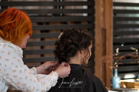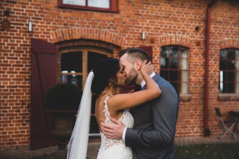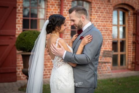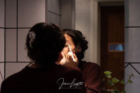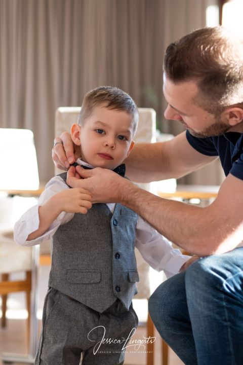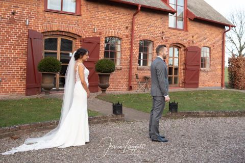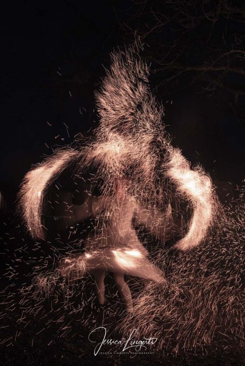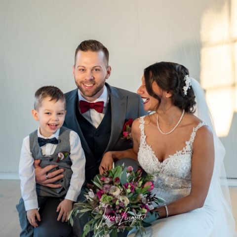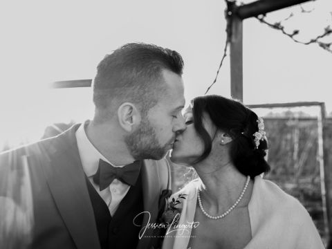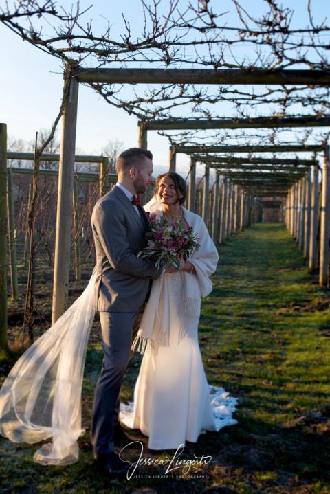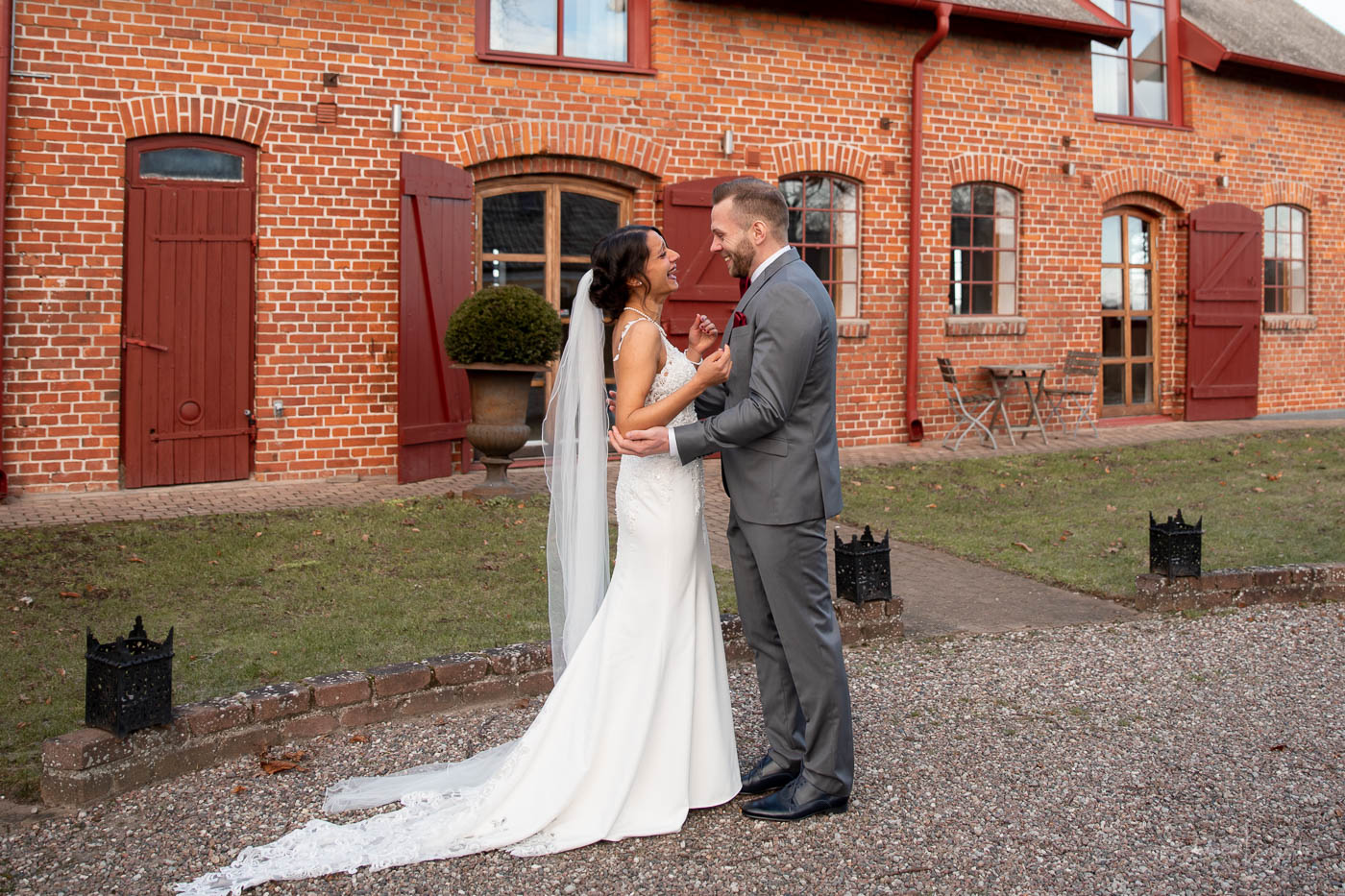 Nellie, David och sonen William besökte mig under Borgeby Slotts fest- och bröllopsdag hösten 2020. Bröllopet var planerat till den 15/5 2021 och festen skulle hållas på Borgeby Slott. Vi pratade en stund och precis när dom är på väg att gå så hör jag William viska till David “pappa – titta äpplet”! På mitt bord låg ett alldeles nyplockat Ingridmarie-äpple från trädgården. William fick äpplet och sedan den dagen så är jag Jessica med äpplet. I december 2020 fick jag ett samtal från David, “jo det är så att Nellie har blivit gravid”… Dom undrade om jag kunde tänka mig att fotografera dom den 16 januari istället för den 15 maj? Ja, januari är inte någon högsäsong för bröllop så självklart kunde jag det! Från förberedelser hos Salong Sigill till påklädning, first look, porträttfotografering, vigsel och eldshow. En heldag med ett underbart par! Med sin allra närmaste familj, jag och vigselförrättaren fick Nellie och David varandra på Flädie Mat & Vingård en kall vinterdag. Nellie hade sedan ett tag tillbaka informerat mig om att en eldshow skulle hållas och överraskningen för David och gästerna var total!