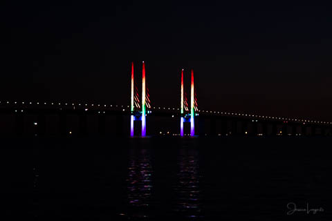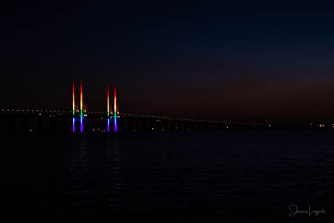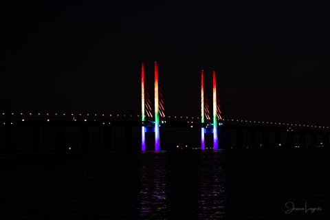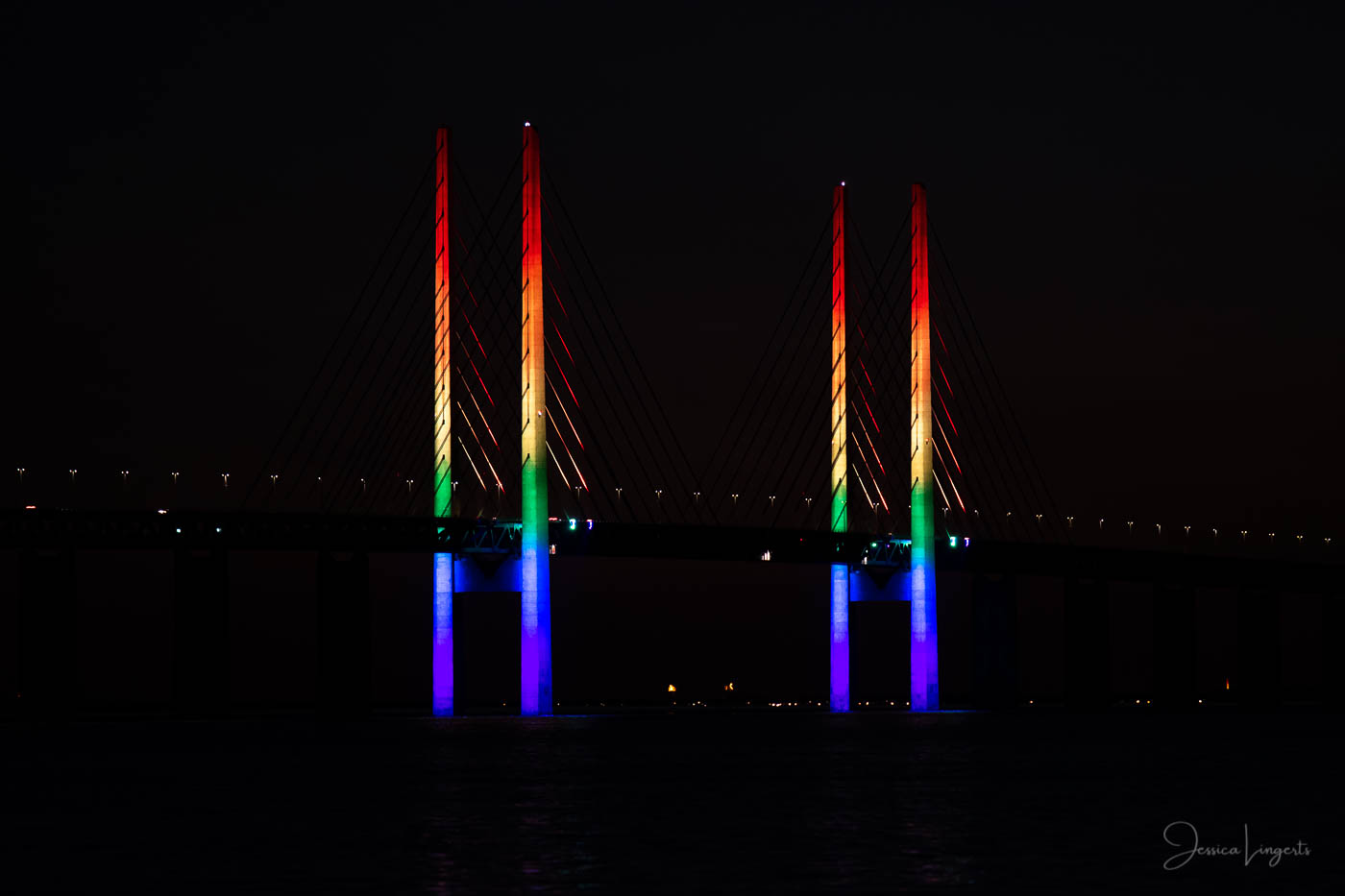 För första gången hölls World Pride och Eurogames i två länder samtidigt, ett jätteevent som knöts ihop av en regnbågsfärgad bro. Med fullpackad kameraryggsäck, tålmodig man och stadigt stativ tog vi oss längst ut på stenarmen i mörkret sista dagen för att få se den vackra färgsprakande bron. Malmös Turning Torso fastnade också på bild.