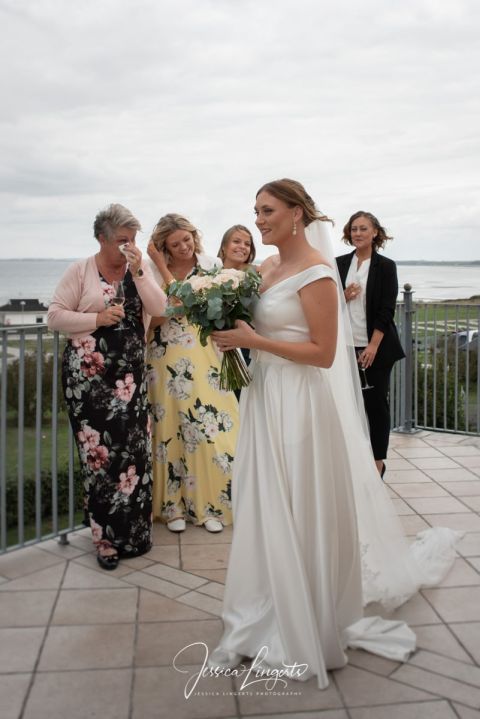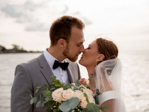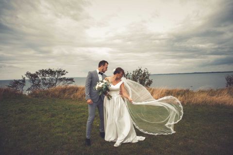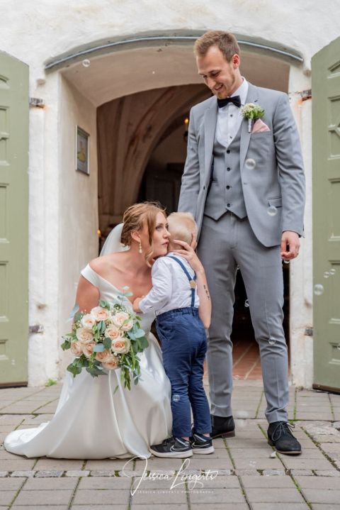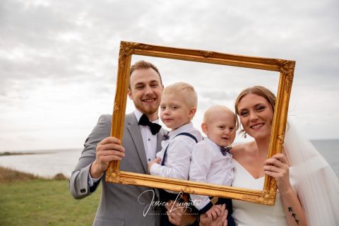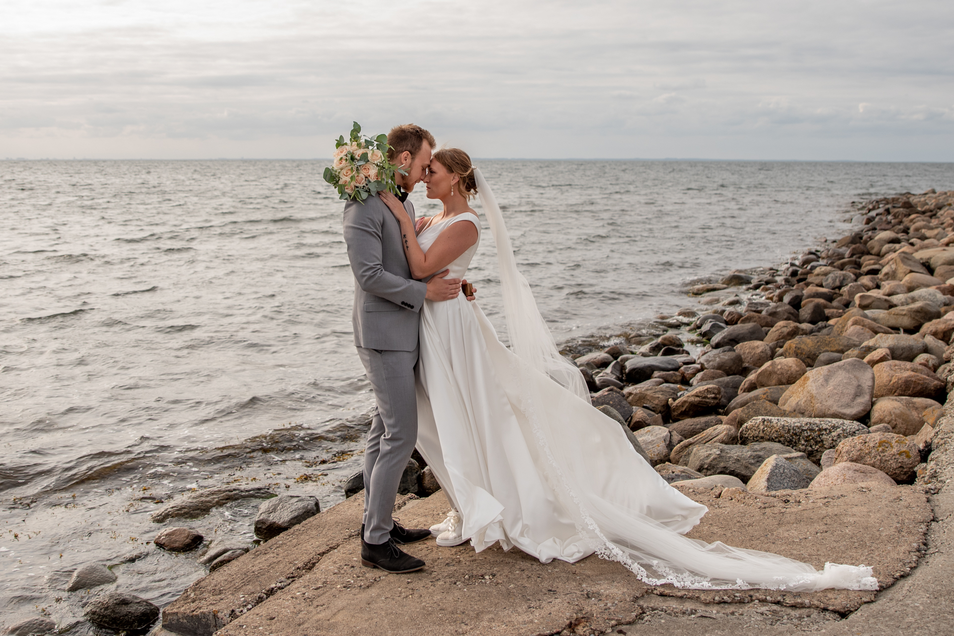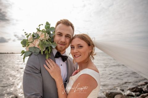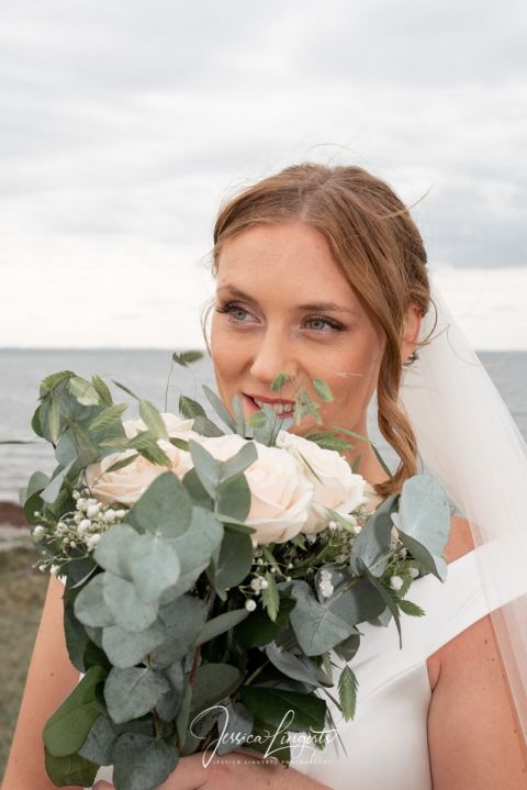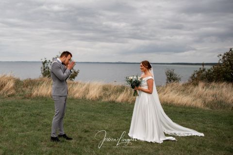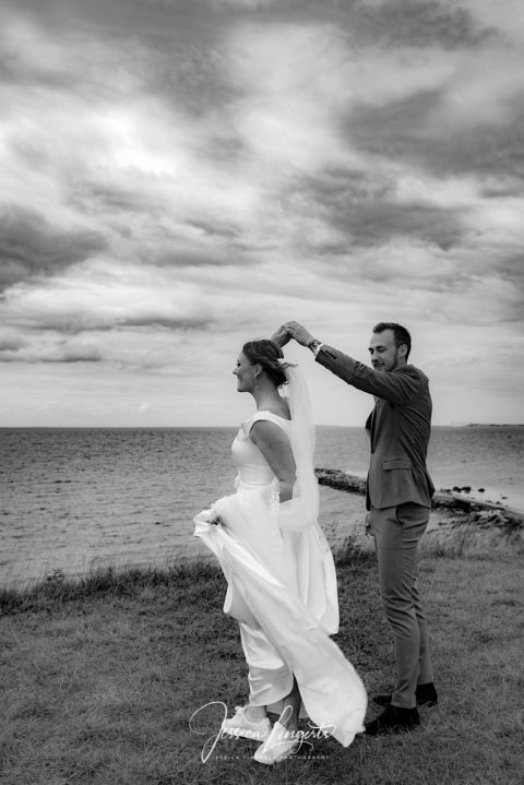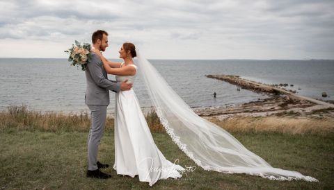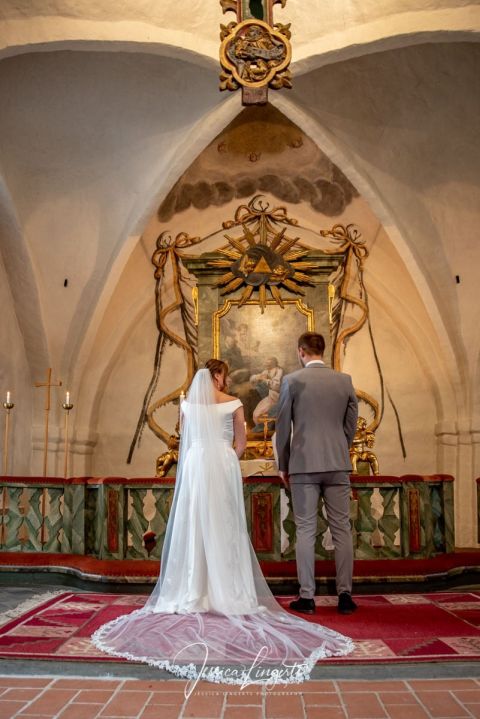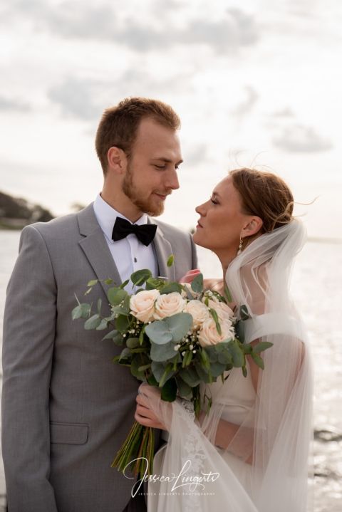 Den 11/9-2020 var en synnerligen blåsig dag med regnet hängande i luften. Den vackra bruden Sandra och hennes tärna gjorde sig i ordning på mysiga Barsebäcks Badhotell. Jag mötte upp en nervös och spänd Johannes för first look på Barsebäcks strand uppe på Gillhögs ängar, där var det egentligen tänkt att vigseln skulle gå av stapeln men då vädret var osäkert så var även Barsebäcks Kyrka bokad. Porträttfotografering med vind i slöjan och vågor på vattnet gjorde bilderna dramatiska och helt underbara. Vigseln var inte något mamma och pappa skulle göra ensamma, tyckte barnen…. Det blev en jättemysig familjevigsel och alla var nöjda och glada.